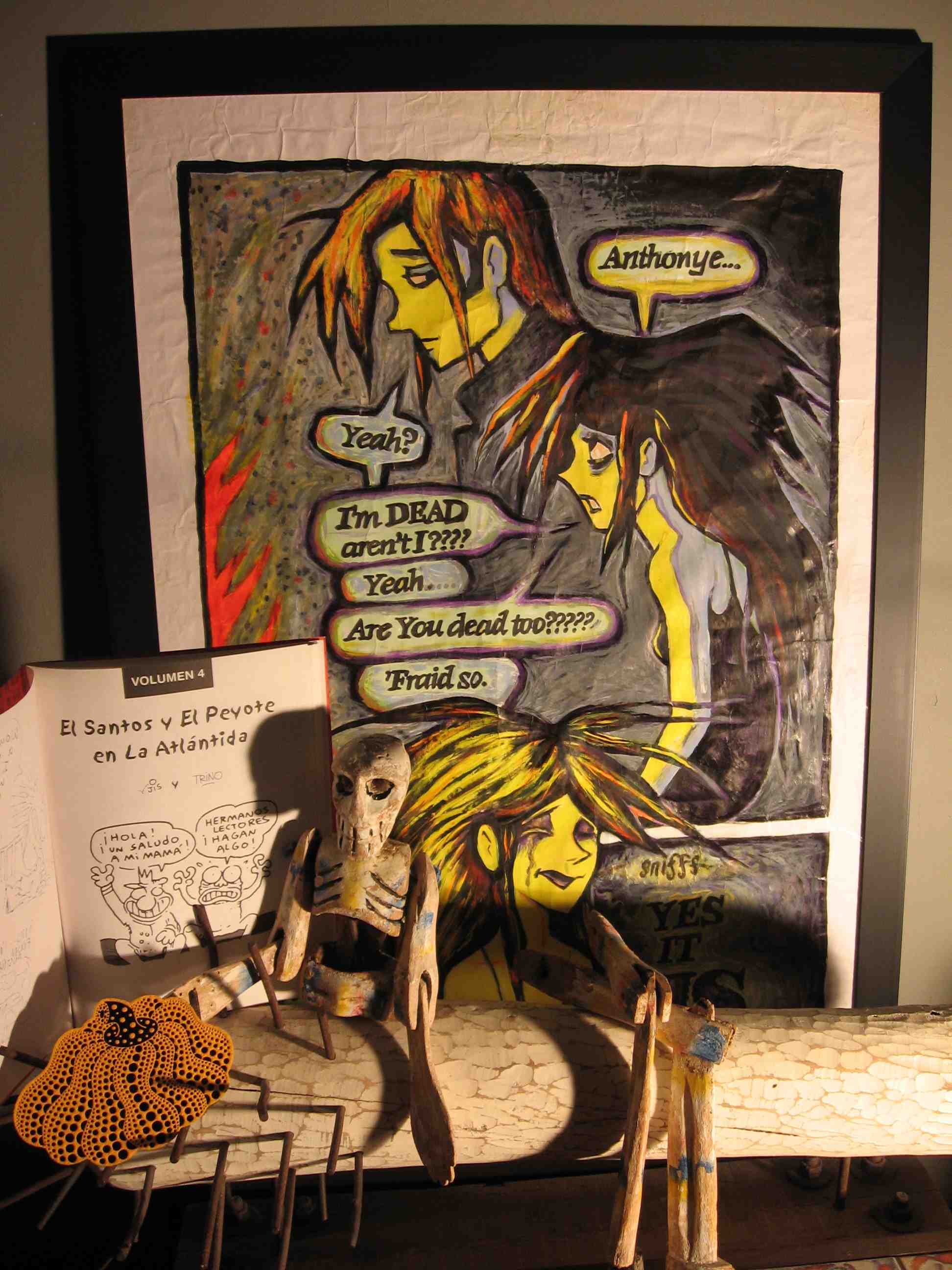 A painting by Louise Graber of a page from her comic Black Light Angels…a comic by Jis & Trino…a Halloween pumpkin card by Yayoi Kusama…skeleton doll and sculpture The Cloud by Richard Black are grouped for Halloween and Day of the Dead!