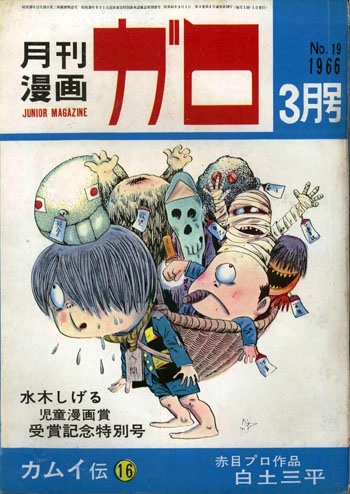 Mizuki’s cover illustration for GARO magazine of his character Kitaro carrying a basket crammed full of yokai characters.