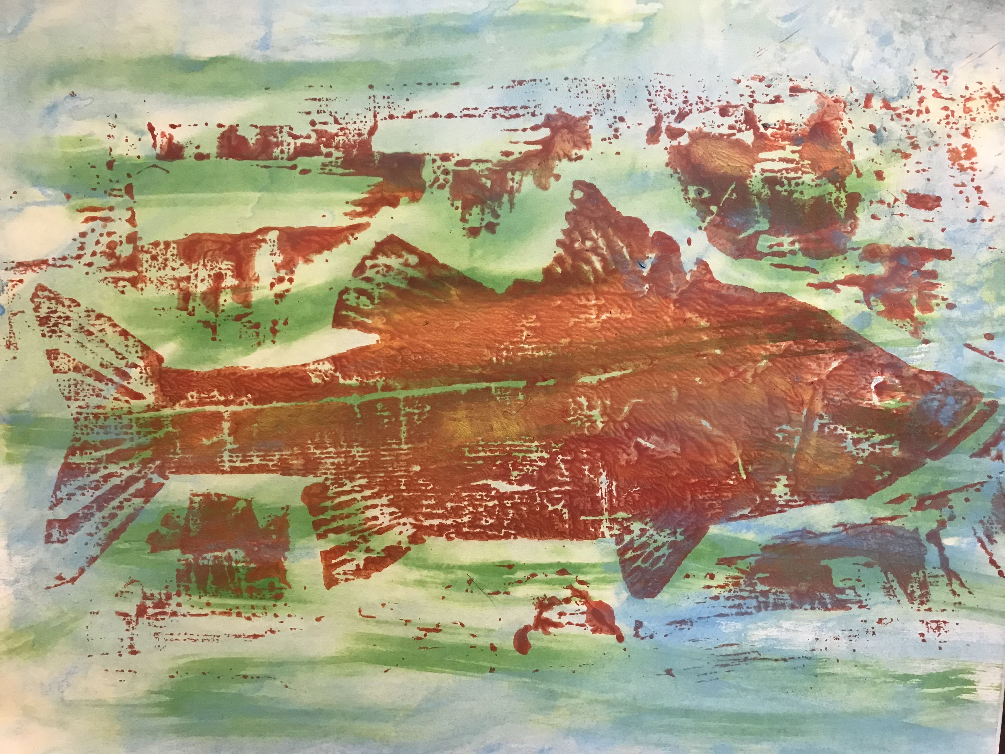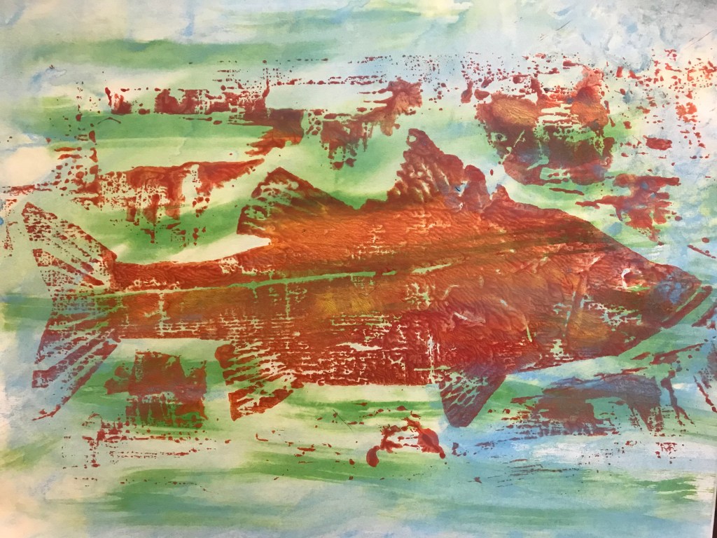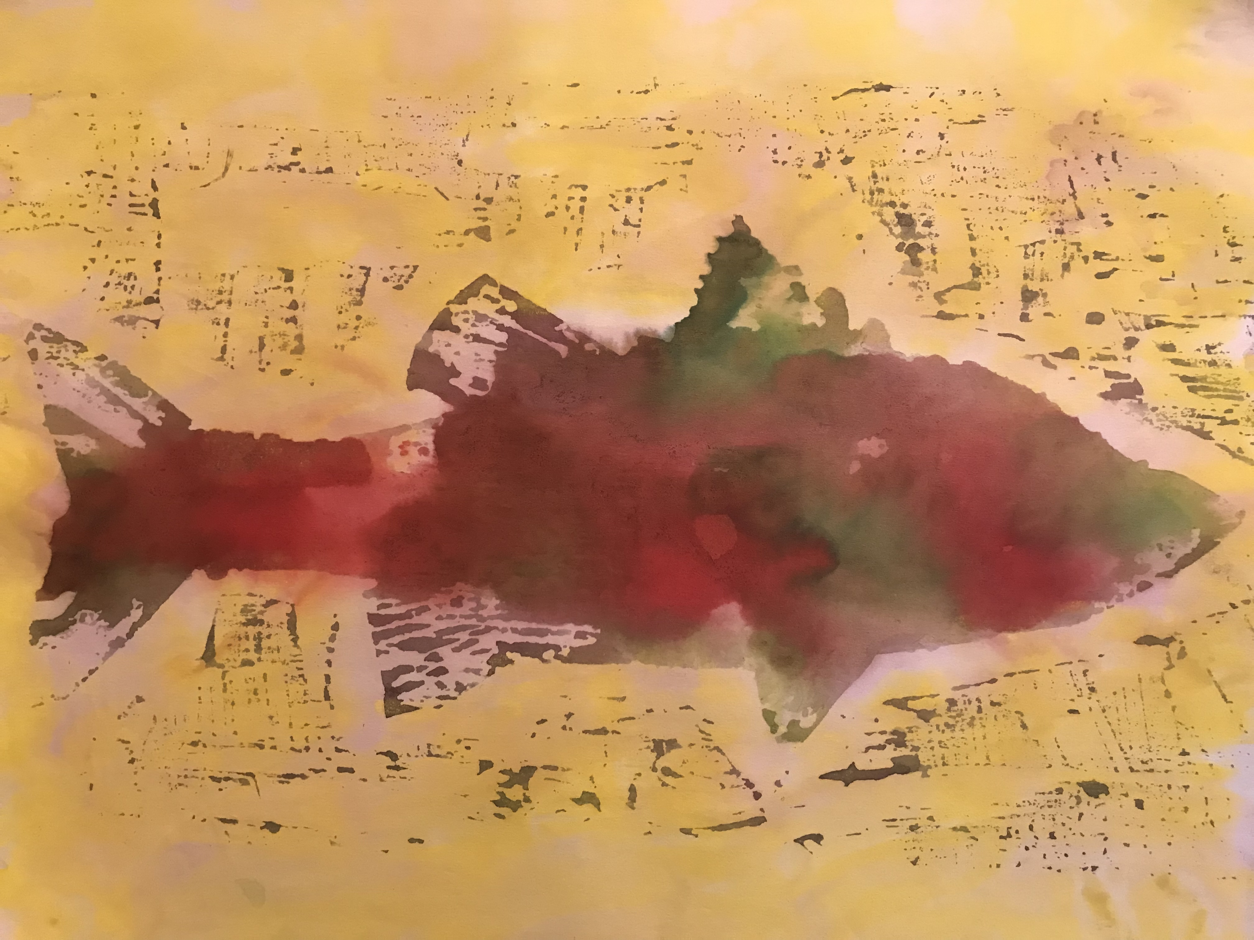 A later grouping of one species of the fish for art gallery exhibition. This composition had torn and collaged prints assembled in a school formation. It completed the process from design to printmaking to animation to film.