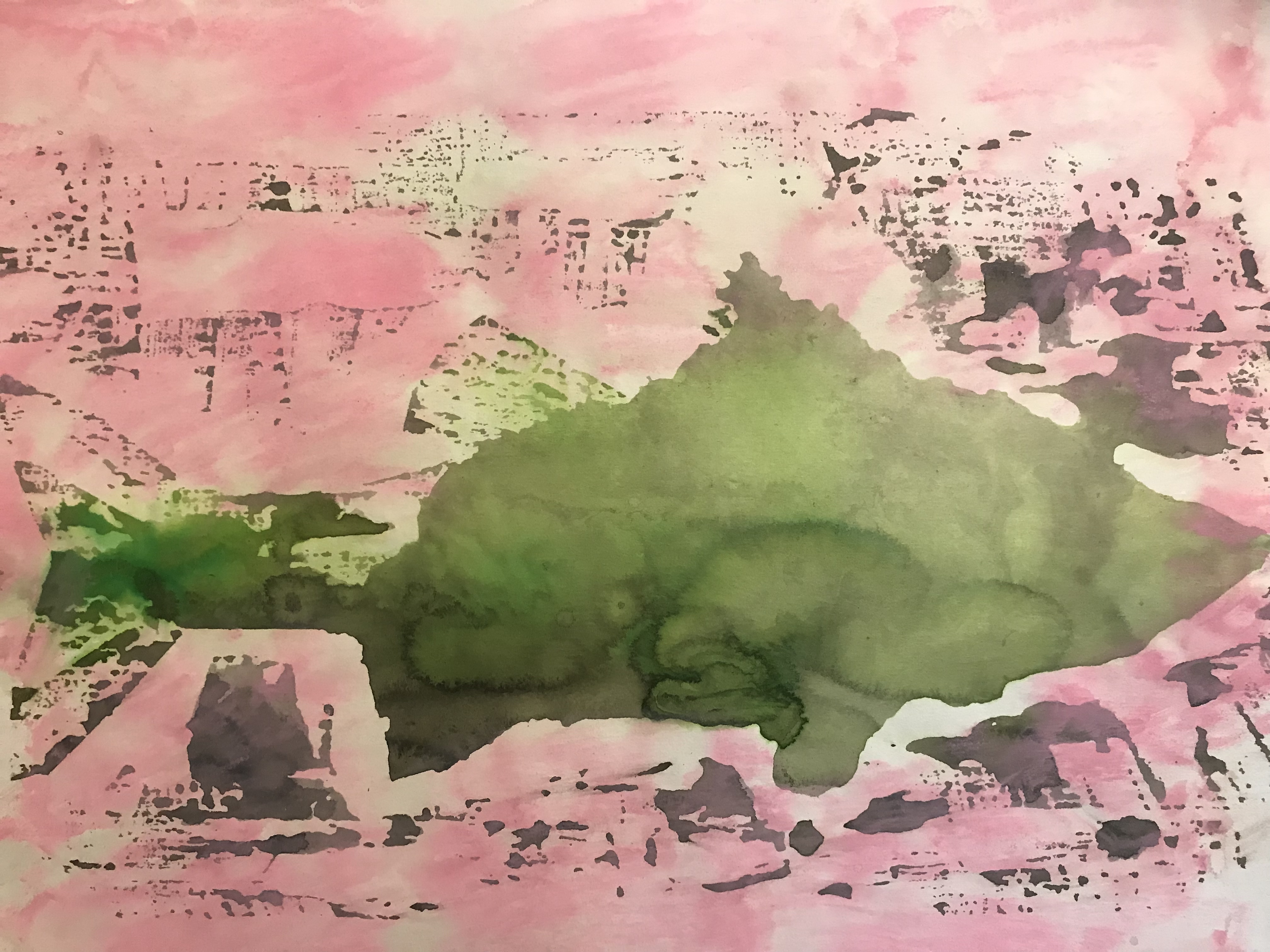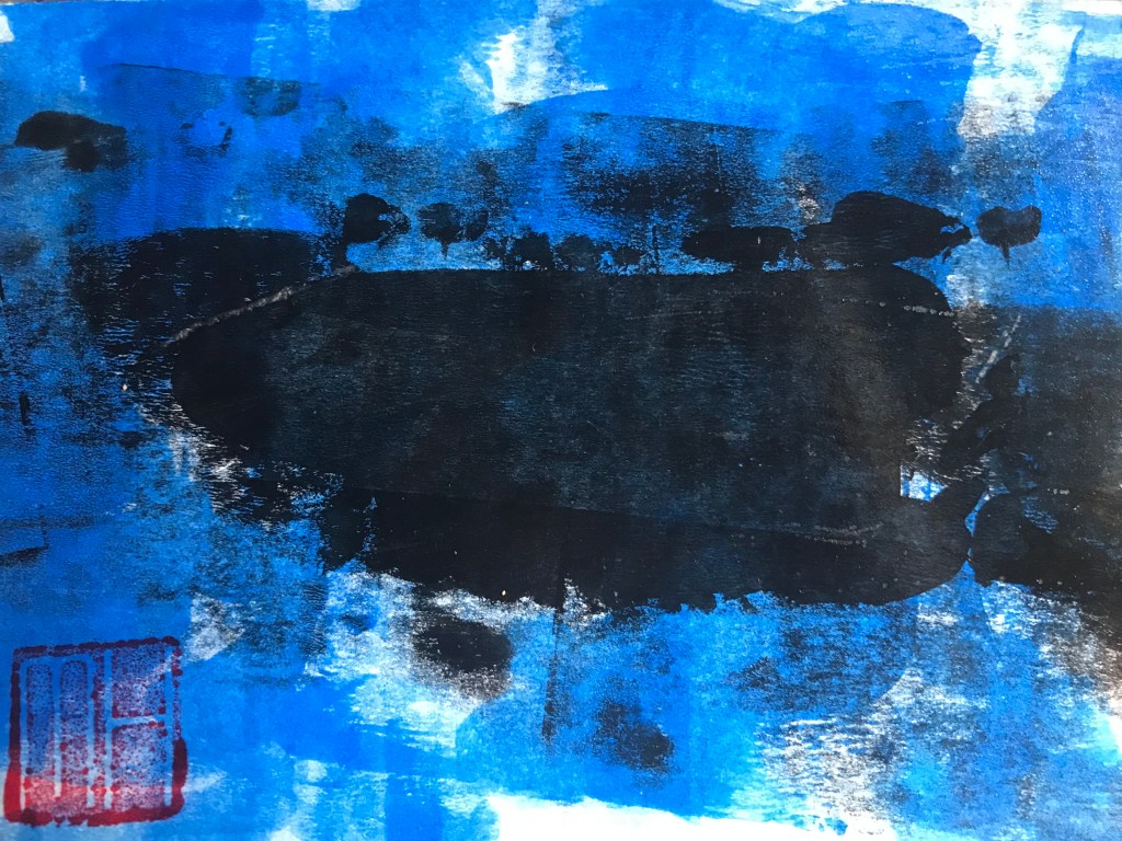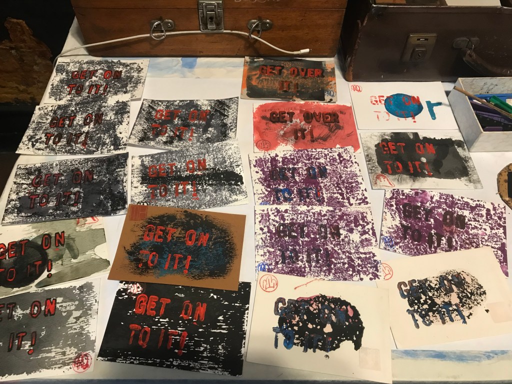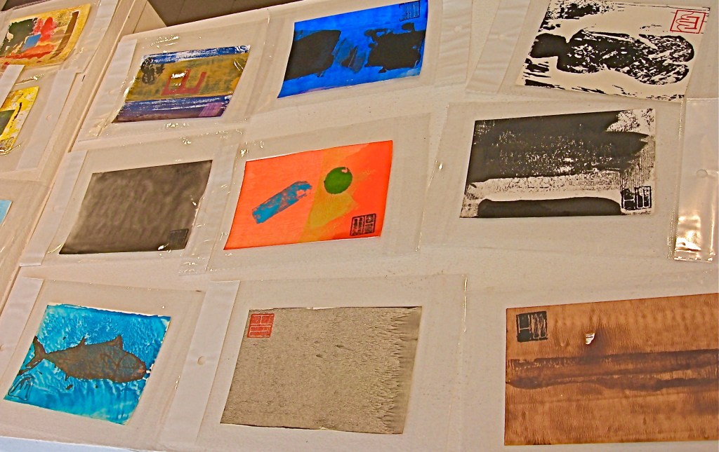 This post profiles recent experiments in my creation and design of art postcards whilst working in my studio and employing drawing, painting and printmaking techniques with uncertain outcomes. I love working in the studio and particularly in the post card production process, especially as it involves printmaking. I do small runs of prints, usually less than 50, although each card may go through the run multiple times depending on the number of layers, as indicated in the photos below.