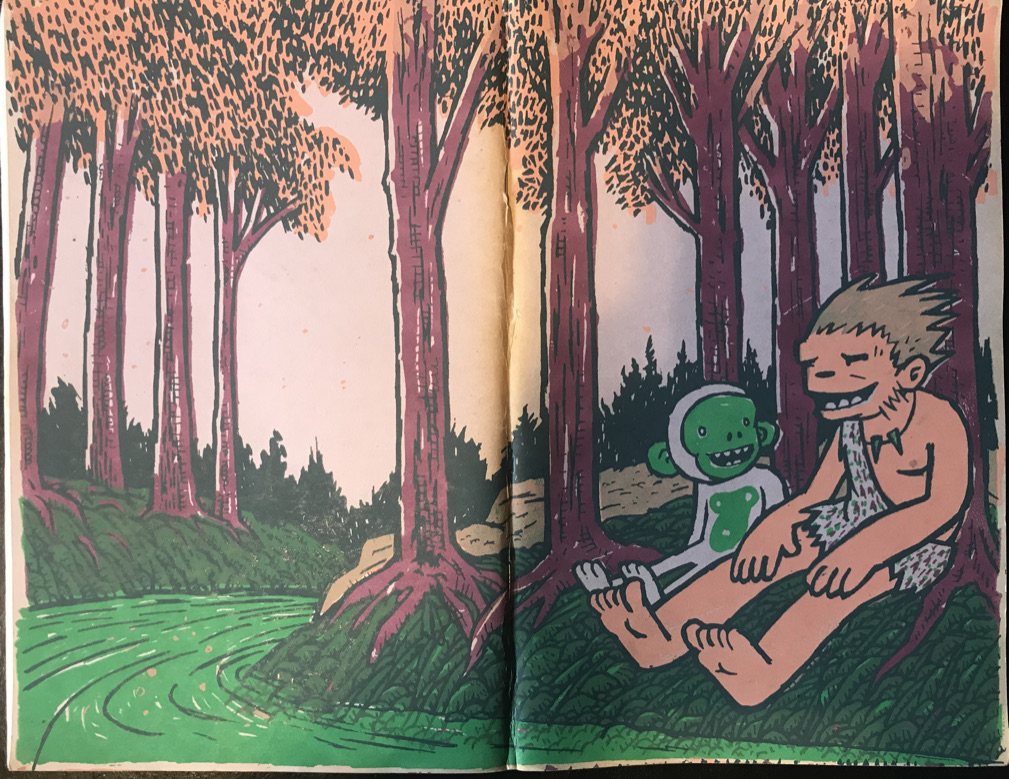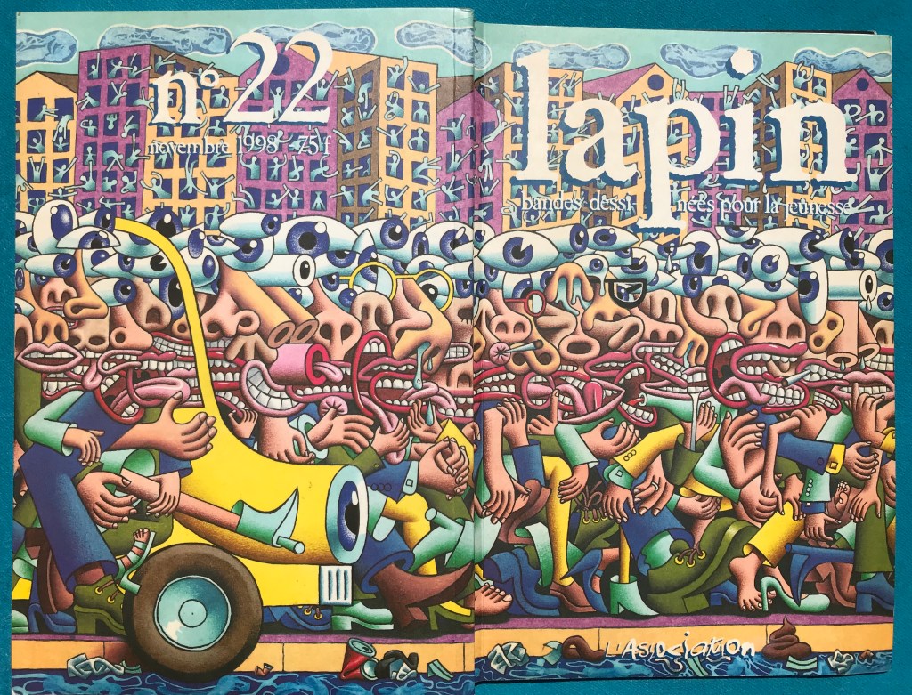 Cover of an edition of the French comics journal lapin: bandes dessinees pour la jeunesse…produced by La Association.The journal has been opened and pressed, open side down, flat on the desktop, for the photograph…due to the difficulty I had getting it to lay flat for the photo.