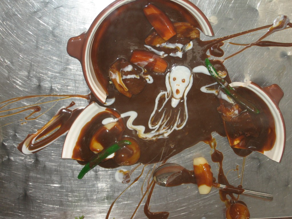 This photo of an interpretation of Edvard Munch’s “Scream” painting…as a decorated, demolished cake in a shop window in Tokyo somehow comes to mind at this time. Perhaps it is picking up on the cheeky attitude apparent in the work of those two Mexican artists.