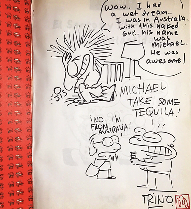 At that comics art conference I also met Mexican cartoonists Yis and Trino who were guest artists. We had an hilarious and somewhat chaotic conversation. In the end I bought a copy of their comic and asked them to sign it…not expecting their amusing graphic response. They drew a cartoon of me with them playfully trying to embarrass me…but now I have their original sketches which I treasure. What a hoot!