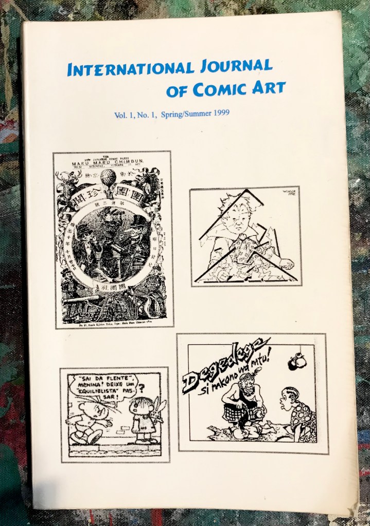 The publication of the International Journal Of Comic Art provided the perfect platform to record and promote comics art research. Above is a photo of the first issue of the journal from 1999. It has since reached the milestone of 50 published issues, chalking up 25 years of continuous publication. I purchased the first issue of IJOCA, (pictured above) at that conference and took out a subscription. And along the way I became the Australian representative of the journal’s International Editorial Board. Later, Professor John A. Lent was one of the examiners of my PhD thesis on Australian alternative small-press comics. The journal seemed to progressively grow in size into a solid block of pages that I affectionately nick-named the “BRICK”. I even created a couple of cartoons about its postal delivery problems due to its bulky size. It had started out as a rather slim volume before blossoming into its bulging “brick” shape and weight. A thousand cheers to you, John!