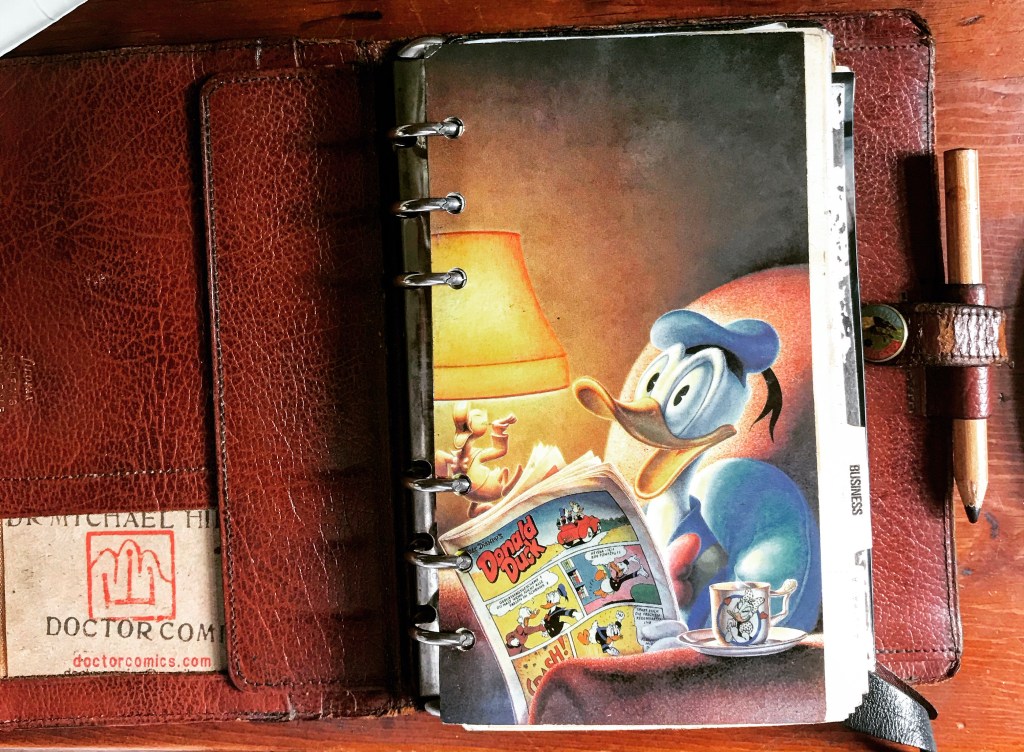 First page of my Filofax…a postcard of Donald Duck reading his own comic…a self-reflective reminder of my love of comics, comics art research, and my visit to the Disney Studios in California.