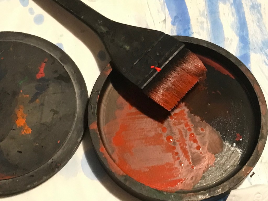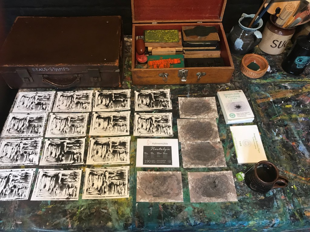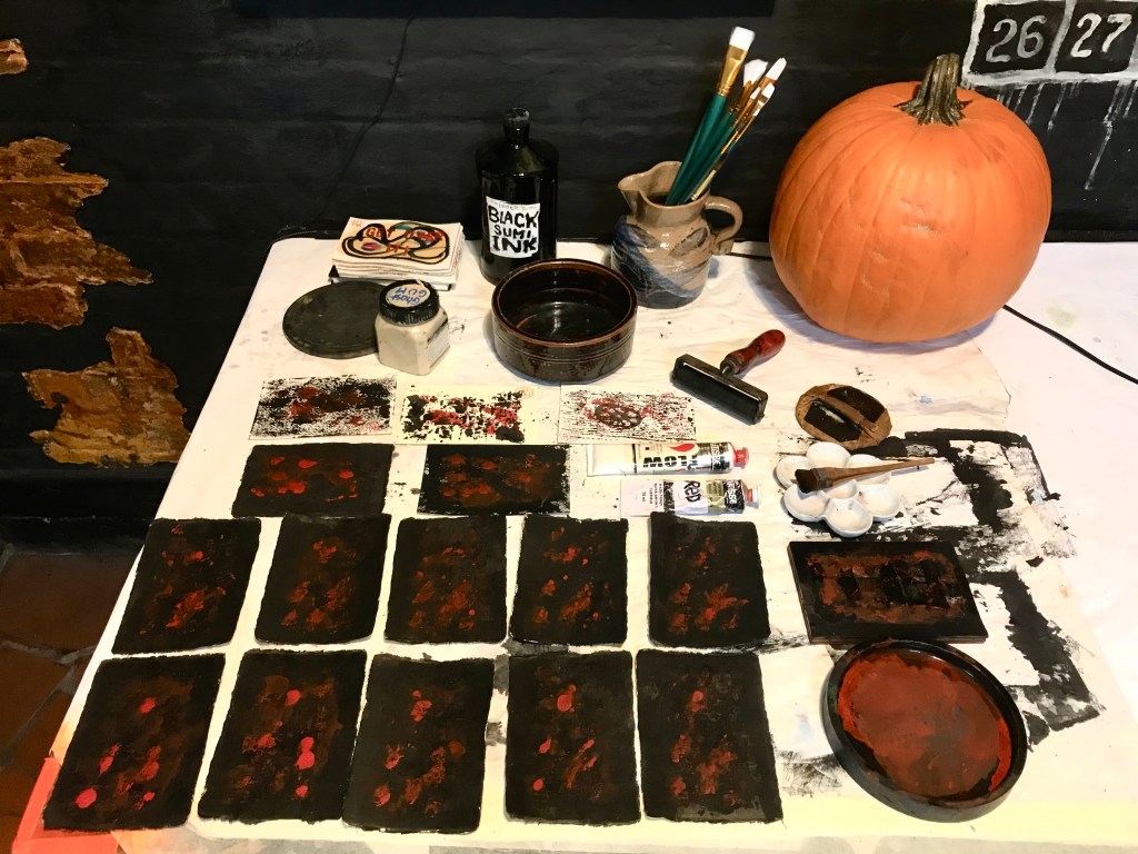 A rough sketch idea for the design of a postcard. This one remains at that stage.Type overlay for postcard that has already received base layer(s). This one will be the top layer.Two different designs with the one on the left having received its base layer whilst the one on the right has had two printed layers: base plus overcoat.Sumi ink dish being used as a paint pot with Hake brush.The black postcards have had two print layers whilst the three cards above them have had three and the stack of post cards at the top left, having dried, have had four.The pumpkin was visiting the studio around Halloween time.A selection of different postcards most of which have had two runs through the print ing process. Note also the addition of my artist stamp, at top left or bottom right, on some of the cards.