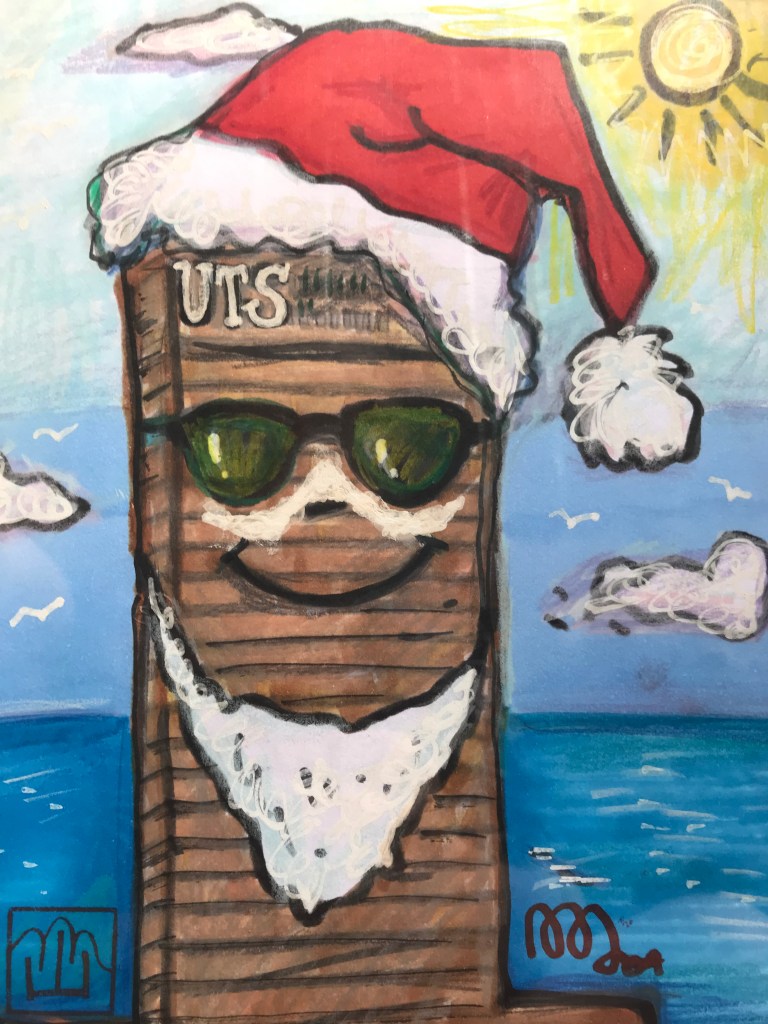 This is a cartoon I created back in my University years. In fact it features the university where I was employed at the time of my retirement, namely the University of Technology, Sydney, and was published in their staff and student newspaper. With it being a city university located in the heart of the city of Sydney, and Xmas occurring in the middle of summer in Australia, I took the liberty of moving the University’s famous Tower building to the beach, the famous Bondi Beach in Sydney, and having Santa smeared with suncream, wearing sunnies, and staring out to sea. Now seemed like a good opportunity to bring it back out with it being summertime in Sydney and right between Xmas and New Year. So, I hope you’ve had a very Merry Xmas and I wish you a Happy New Year!