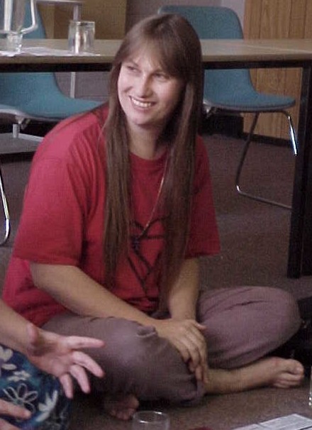 The artist, Louise Graber, at an exhibition of her work. She is standing alongside an enlarged and painted panel from her comic BLACK LIGHT ANGELS. (Photo-© 2012 Dr. Michael Hill a.k.a. Doctor Comics).