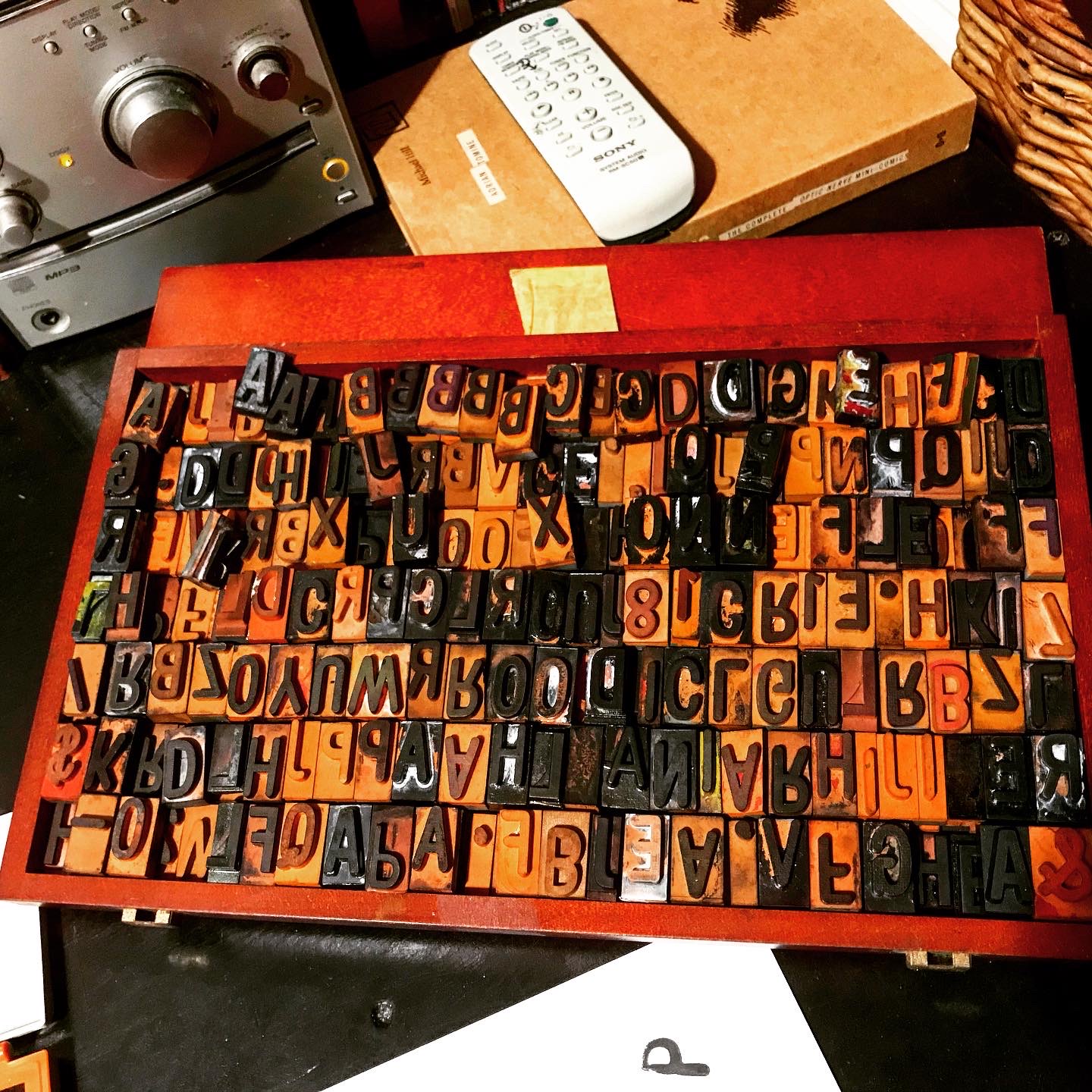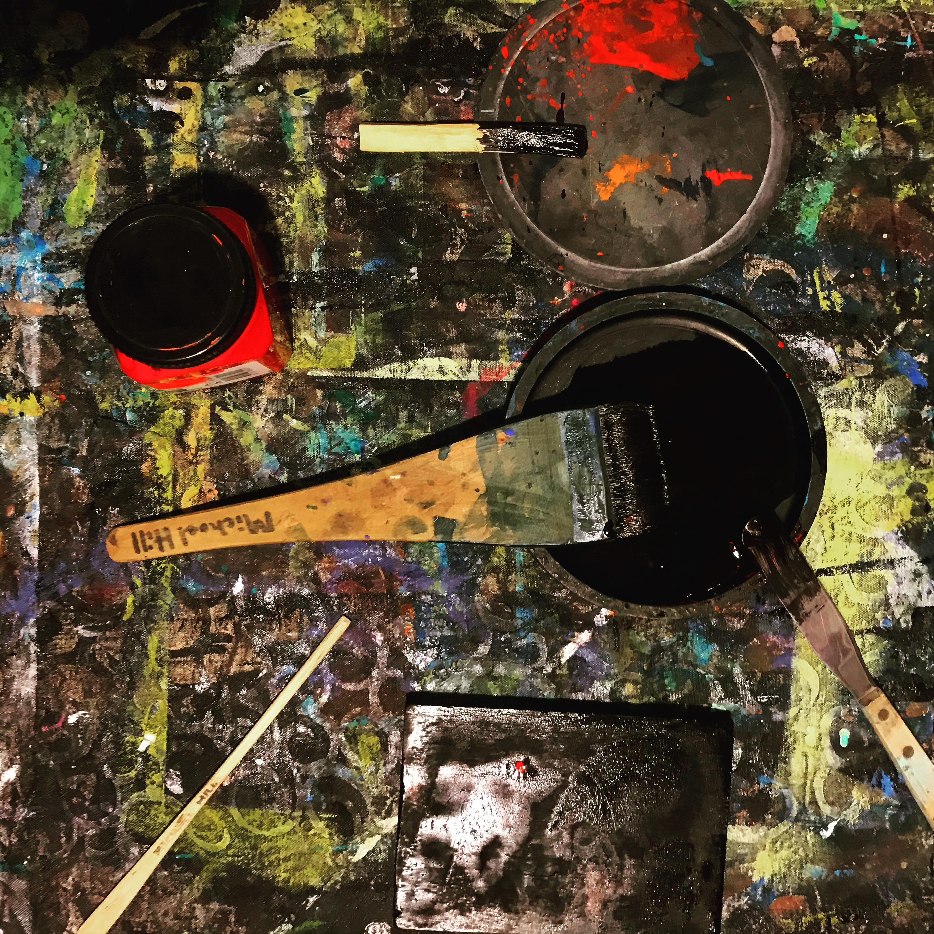 A rough sketch idea for the design of a postcard. This one remains at that stage.Type overlay for postcard that has already received base layer(s). This one will be the top layer.Two different designs with the one on the left having received its base layer whilst the one on the right has had two printed layers: base plus overcoat.Sumi ink dish being used as a paint pot with Hake brush.The black postcards have had two print layers whilst the three cards above them have had three and the stack of post cards at the top left, having dried, have had four.The pumpkin was visiting the studio around Halloween time.A selection of different postcards most of which have had two runs through the print ing process. Note also the addition of my artist stamp, at top left or bottom right, on some of the cards.