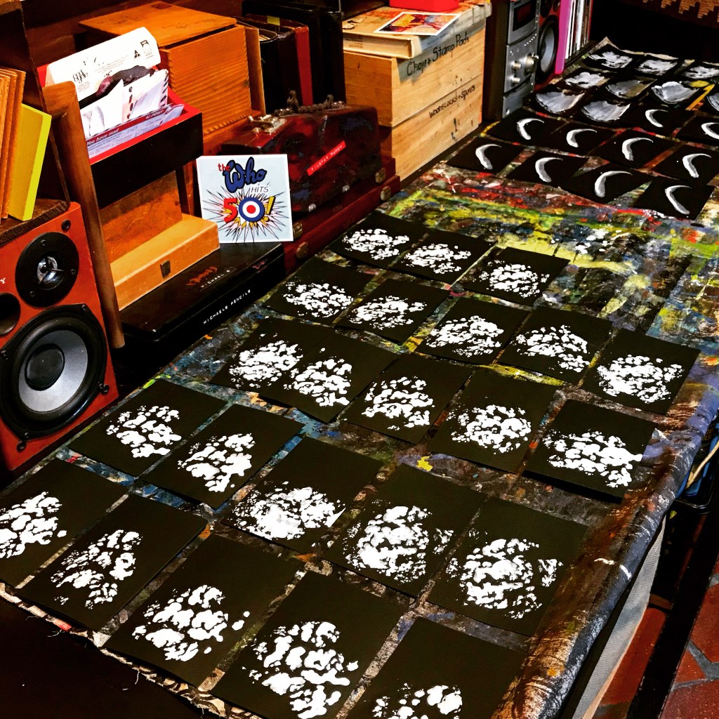 This post features assorted photos of the production stage of my art projects…whether on postcards, prints, paintings or comics…produced by hand in a small studio…whilst listening to music (some photos show a glimpse of the music machine and the disc being played)…taken over the past few years.