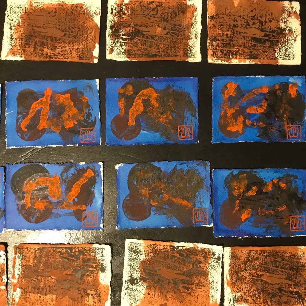 This post profiles recent experiments in my creation and design of art postcards whilst working in my studio and employing drawing, painting and printmaking techniques with uncertain outcomes. I love working in the studio and particularly in the post card production process, especially as it involves printmaking. I do small runs of prints, usually less than 50, although each card may go through the run multiple times depending on the number of layers, as indicated in the photos below.