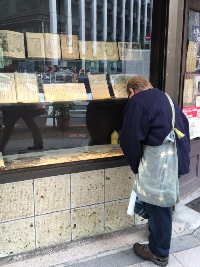 Doctor Comics studies an original scroll in a window of the bookshop area of Tokyo called Kanda. (Photo by Louise Graber)