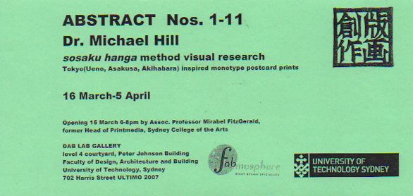 A sosaku hanga (creative print) method visual research and creative practice research project undertaken in late 2006 in Tokyo was exhibited in the new DAB LAB research pop up gallery at UTS and displayed 24/7 under lights and behind glass. Methodology: each print was constructed from multiple printing stages of numerous blocks and the image formed in composite manner rather than by a single impression. The repetition of the overall composite image with slight differences in details within each edition such as colour, pressure, registration, position of individual elements lent itself to subsequent possible animation applications. Format: postcard-small, portable, expedient size to produce whilst travelling, utilitarian. Outcome: 287 print postcards produced in 11 styles with potential for organization into visual sequences of animation.