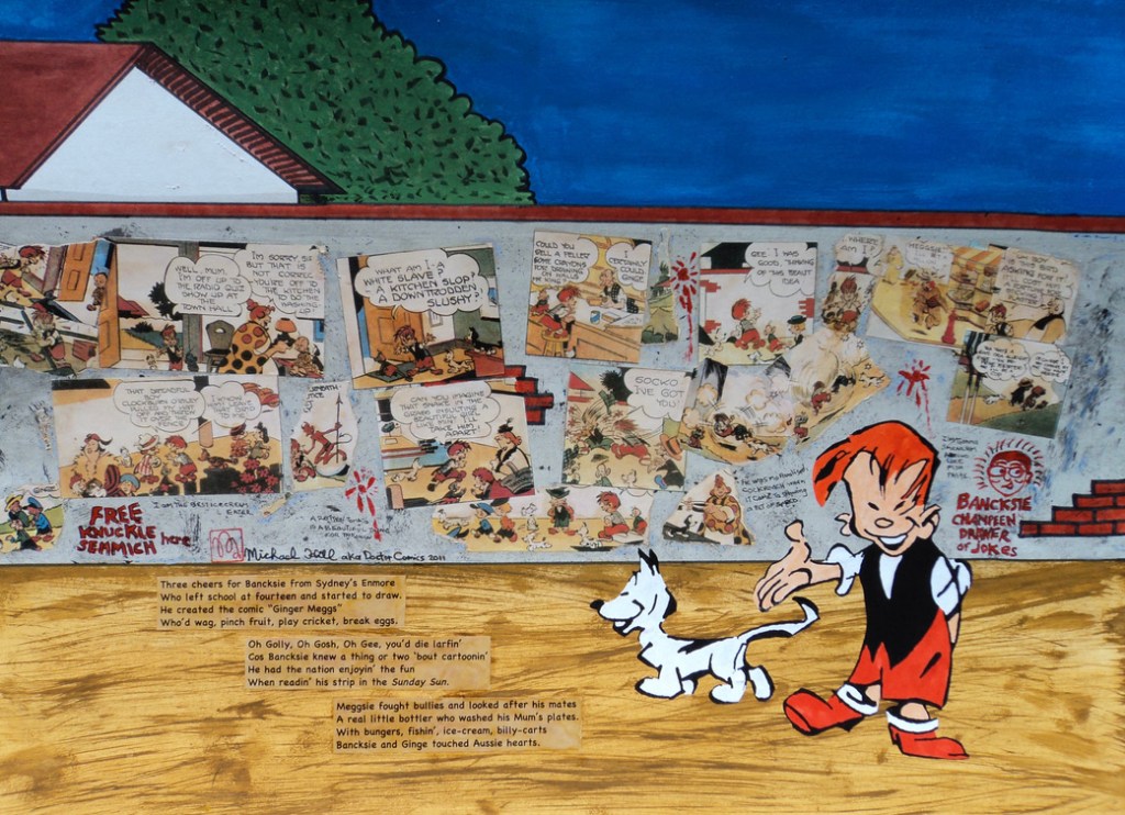 I want to begin my blog by declaring that I absolutely love both reading and creating comics. I have read, collected and studied comics since I was a child. Every Sunday morning after church, I would wait for the opportunity to read the comics section of the Sunday newspaper. My father had first reading rights. He began with the comics section before moving on to the sports pages. He didn’t like to separate the paper into sections, preferring to keep it all together…so the family had to wait till he had finished his complete reading of it. It was good to hear him laughing at the comics. He particularly loved The Potts by Jim Russell, whom I would meet years later at a comics convention in Sydney. He also loved Australian cartoonist Jimmy Bancks’s strip Adventures of Ginger Meggs. It was printed in glorious four tone colour (see my art tribute collage Bancksie Champion Drawer of Jokes, below). He also liked action comics, especially English war tales and American Wild West adventures. He had served as an Australian soldier in the Second World War. Whilst reading the war and western comic strips he would make the sounds of bombing raids and gunfights.