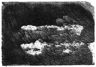 In this chapter the Doctor Comics character is teleported into the supernatural world via a dream experience. To obtain a shadowy landscape for some ethereal figures he encounters, sumi-ink blots have been soaked on soft paper. Over and under-inking the blocks has resulted in intense black or under-inked white patches on the printed paper.