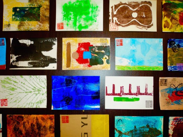 This post profiles recent experiments in my creation and design of art postcards whilst working in my studio and employing drawing, painting and printmaking techniques with uncertain outcomes. I love working in the studio and particularly in the post card production process, especially as it involves printmaking. I do small runs of prints, usually less than 50, although each card may go through the run multiple times depending on the number of layers, as indicated in the photos below.