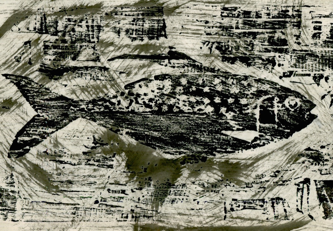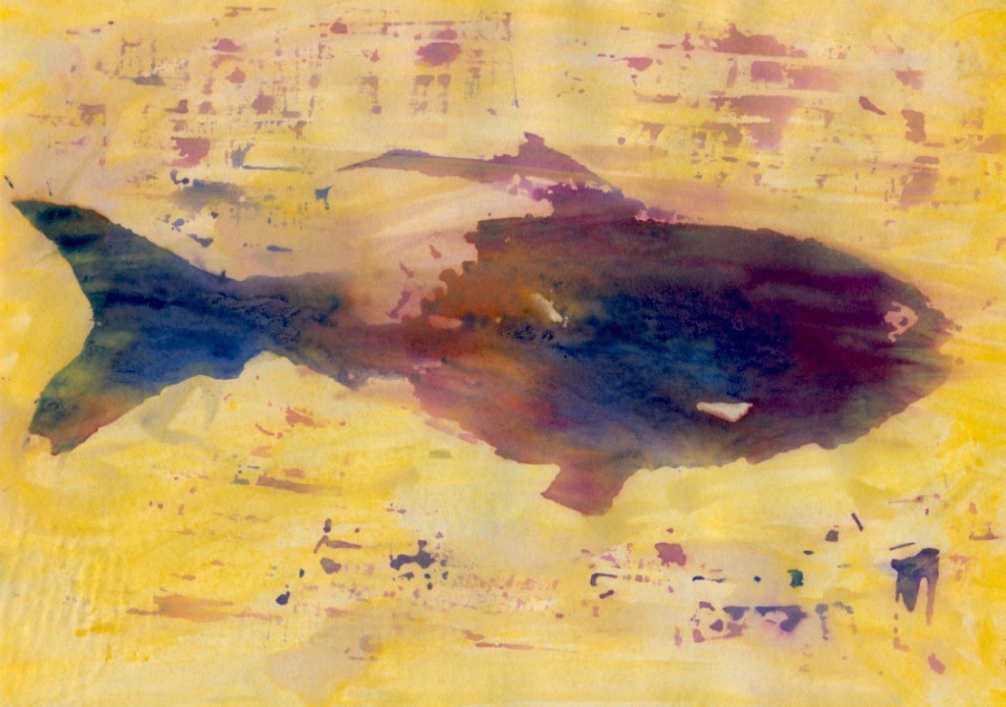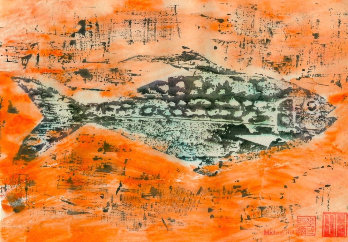 This is the third post based on the fish prints I made using woodblock printmaking techniques…for the experimental animated film Toxic Fish. The fish in this sequence is the Kohada or Gizzard Shad. Its static shape on the woodblock contrasts with the flooding of coloured toxins around it.