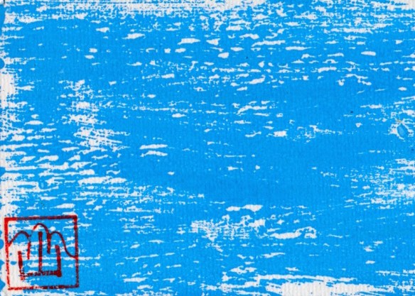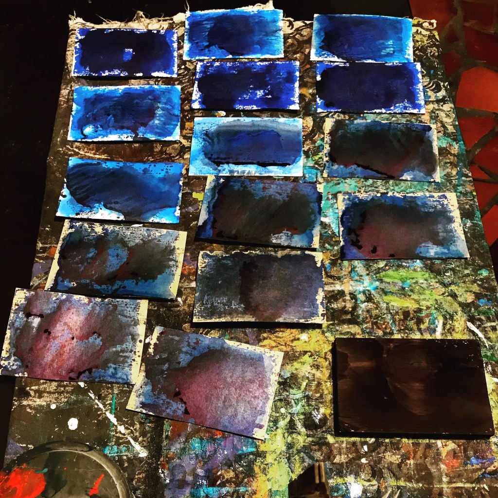 This batch has had two passes across the print table…the base layer followed by a second coating or overlay…as can be seen in the photograph. The two layers of ink that can be perceived are a base layer in blue-black…and a second that has been overlaid with a bluish-purple tint. The ink-stained wooden block used for printing the layers is located at the bottom right of the photograph. In the printmaking process the block is inked and the blank cards laid face down on it…then pressed into/against the ink, then left, wet side up, to dry.