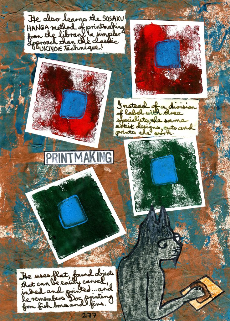 Yet another page from The Cat Cooking Comics In Kappabashi…now Chapter 6 of Blotting Paper: The Recollected Graphical Impressions of Doctor Comics…showing Cohl’s artistic development with his manga mixing…his printmaking and his creative layout of prints…with panels and pages from the randomly found manga during his travels in Tokyo.