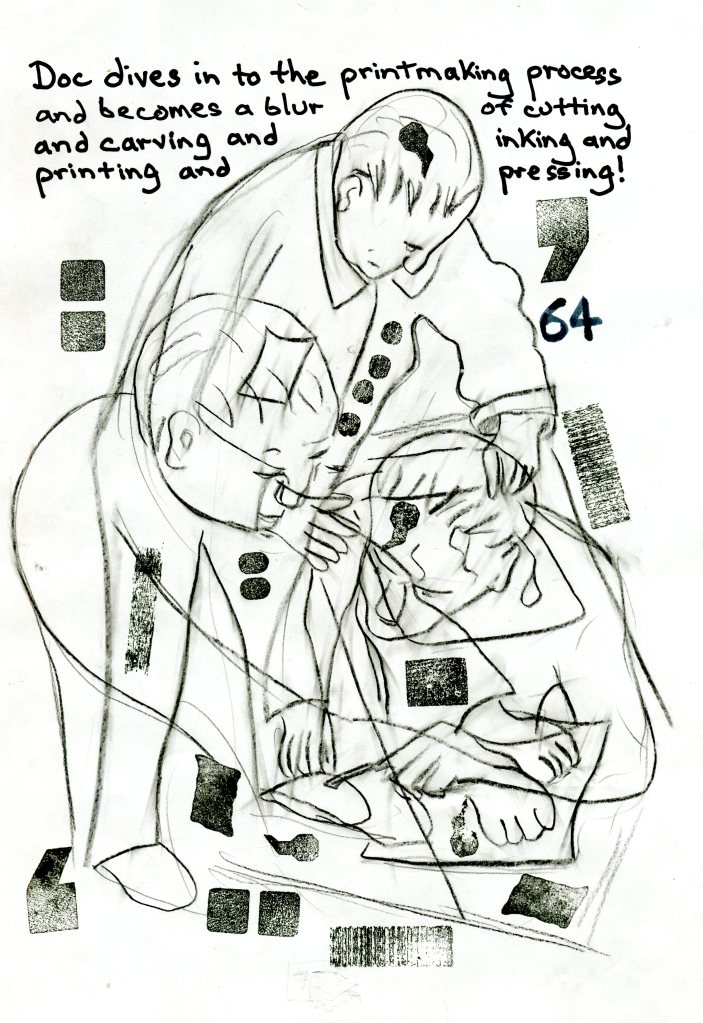 Above, a page from Blotting Paper: The Recollected Graphical Impressions of Doctor Comics showing Doc at work making woodblock prints…an act that Cohl would have observed on several occasions back in Sydney when Doc and the cats lived together…and that would have possibly inspired Cohl to take up printmaking on his arrival in Japan.