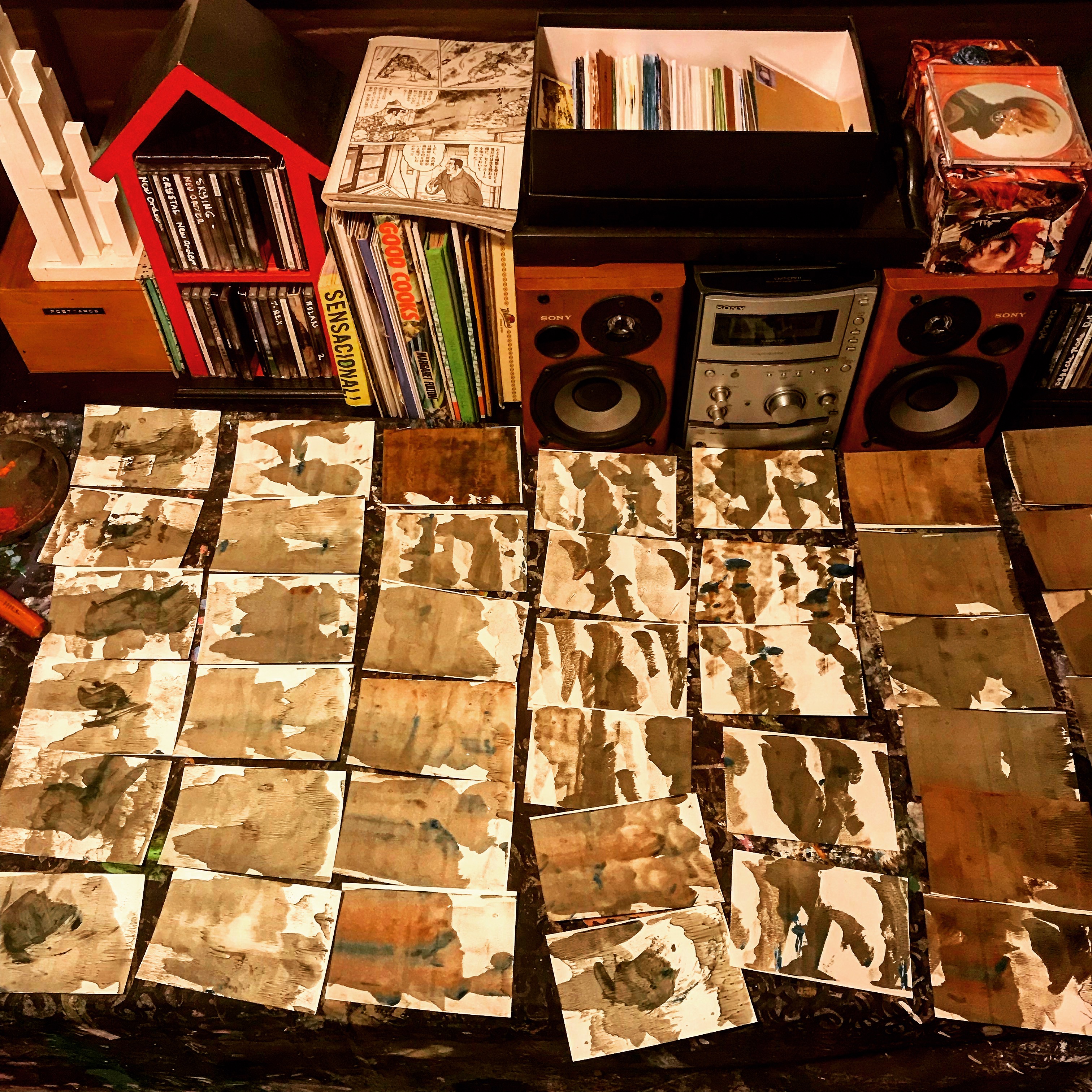 Here is another set of postcards following the design and printing of the base layer. The variation and difference in appearance of these cards, from the same batch and print run, is already discernible.