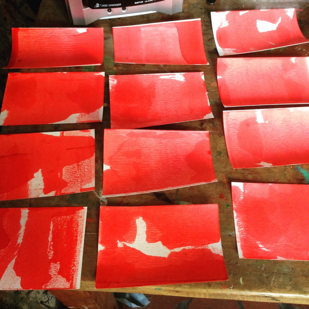 This batch displays a range in base layer design, almost as if it has been altered during the run. This can happen but in this case…there are three distinct base designs in play using a similar tone and hue of ink. That has resulted in three separate series of postcards. Note the musical accompaniment to the printmaking process, David Bowie’s LOW on this occasion. I like to stand right up close to the speakers. I find listening to music whilst working is both calming and inspiring.